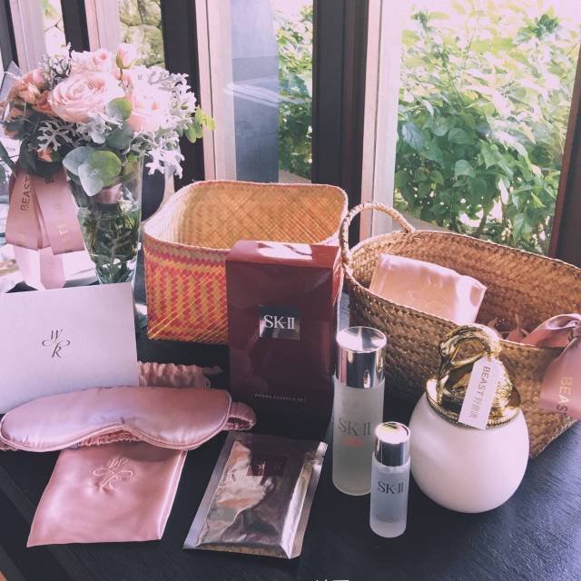 ▲ 很壕!这喜盒放了大招(霍建华亲自置办) ▲ 前方曝光的欢迎礼篮内容豪华:有野兽派的粉色玫瑰花束,有可以贴个面膜护个肤然后美美出席婚宴的SK-II套装,华丽丽的野兽派特别定制真丝眼罩,以及天鹅造型香氛蜡烛。据说伴手礼还是霍建华自掏腰包亲自置办?尊上玩起浪漫也是一套一套的。