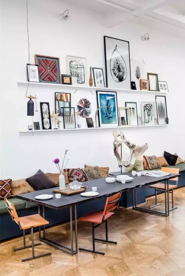 每个空间的布局都独具匠心,插花与盆栽随处可见,最奇妙的莫过于悬挂在两盏灯饰之间的一块木板,上面可以放置一些小巧玲珑的艺术品或小盆栽等,将实用性与装饰性进行了巧妙的搭配,令人耳目一新。