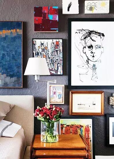 或者把色调和谐,气质统一的画收集一些,大大小小错落有致的挂在一起,也不错。