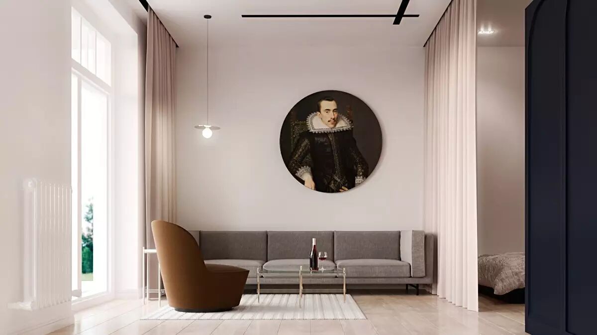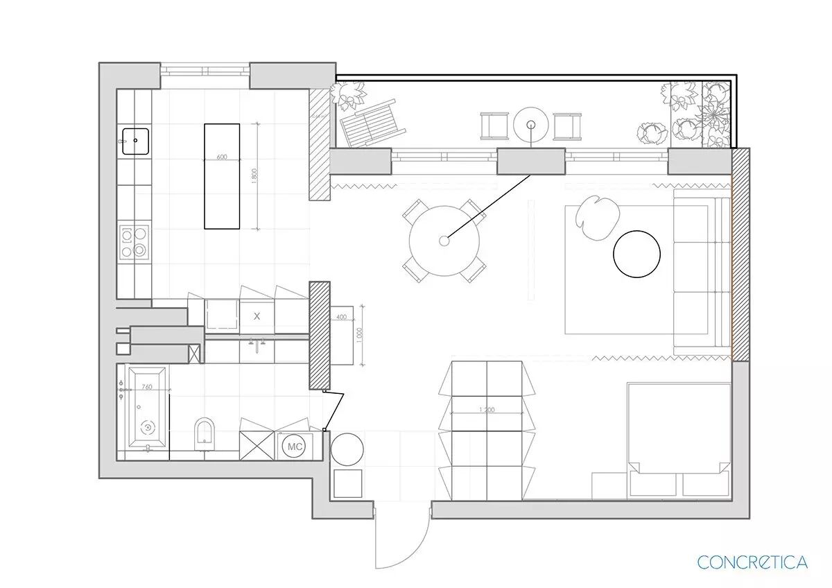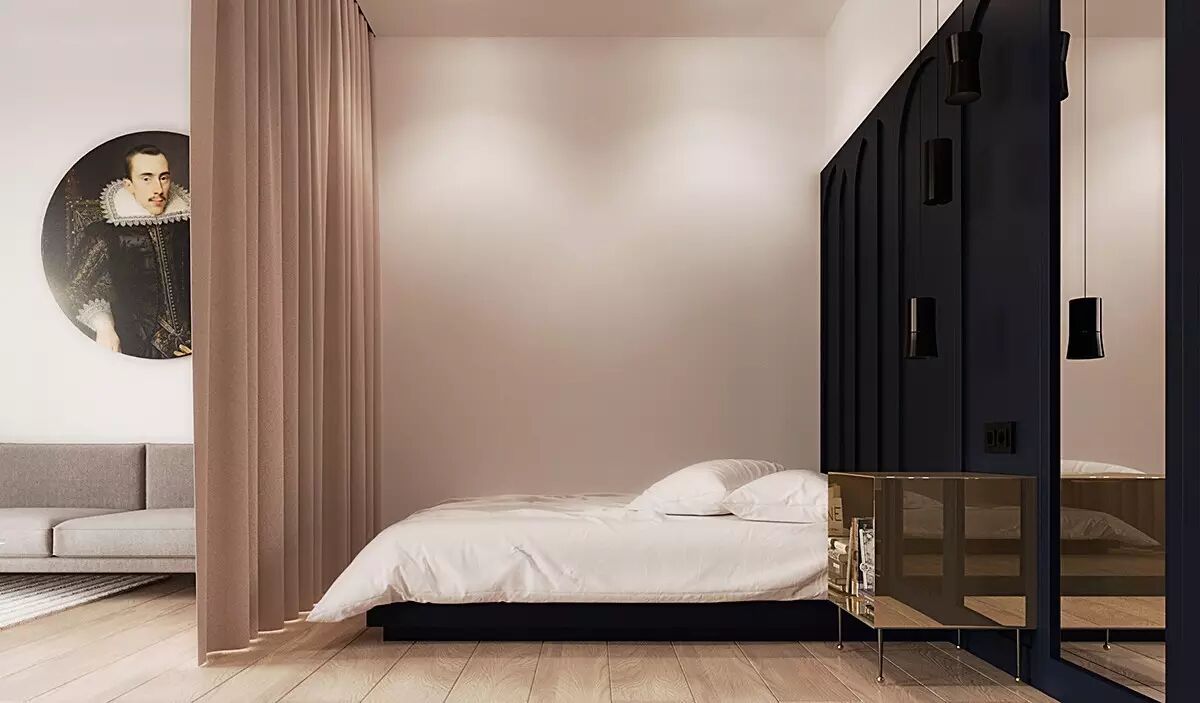 乌克兰设计师 Iya Turabelidze 的公寓空间方案。 空间布局上设计师显然花了心思。开放式的客厅与厨房餐厅形成了一体化格局,使整个空间显得更为宽敞,通过别致凹造型的厨房门洞,显得十分有趣。轻柔的帘幕阻隔了客厅与卧室,让其成为了两个独立的空间。由大大的落地窗自然散发出来的阳光使得整个空间明亮温暖。