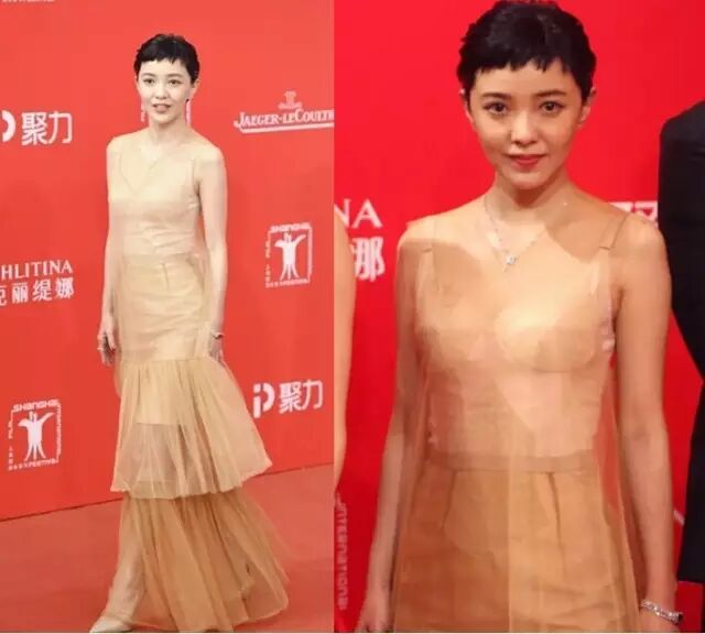 郭采洁的裸色纺纱长裙,同样Hold不住,而且那个发型无力吐槽!