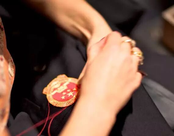 2015年春节华天去唐宁街10号首相府拜年,不忘给礼服绣上中国国徽