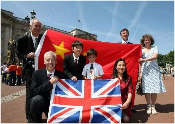 开心的一家人举着中英国旗,在白金汉宫前合影。