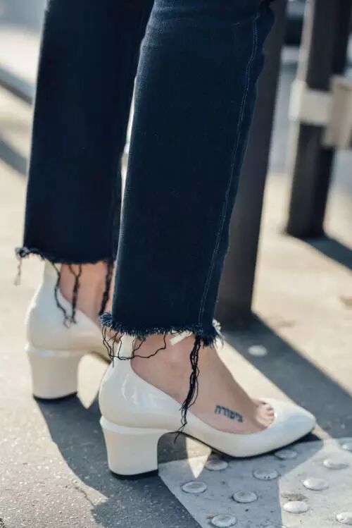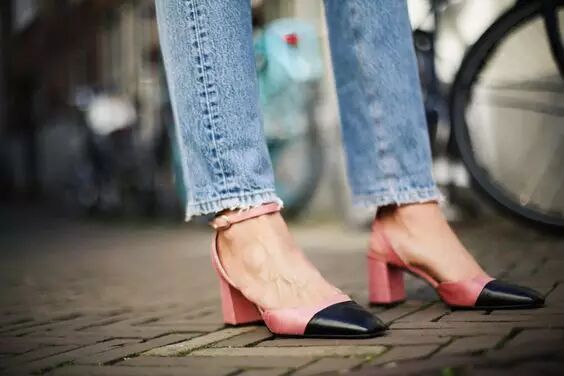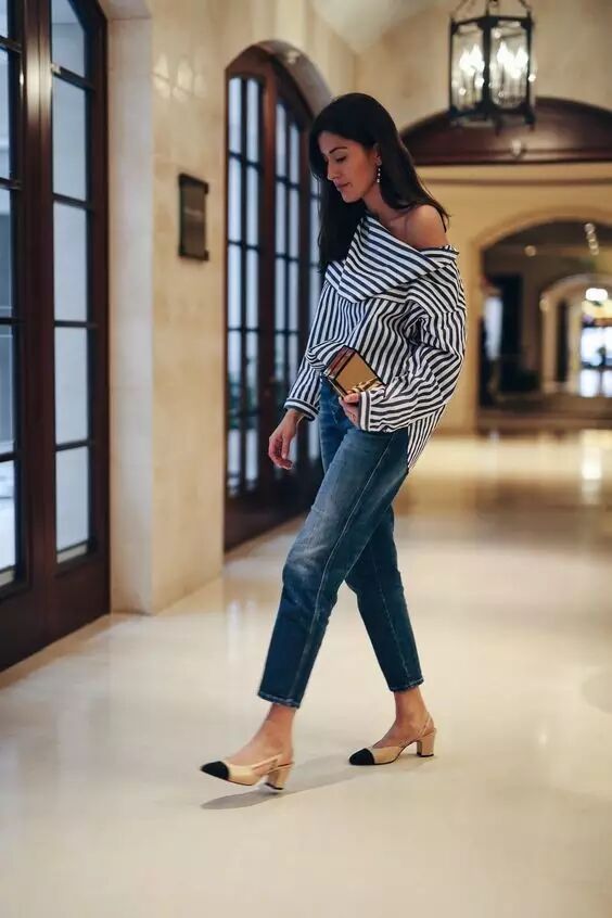 小香风方跟鞋 米色接近肤色的鞋身和尖头的设计在视觉上拉长腿部线条, 后跟只有一根带子固定的设计简单大方, 这款小香风方跟鞋就是方跟鞋中经典, 从上个世纪流行至今,明星时尚达人都爱它。 Icon们的搭配示范 九分牛仔裤+半露小香肩的斜肩上衣, 充满了女性的知性气息。