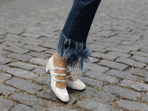 破洞牛仔裤与白色衬衫的休闲风格, 穿上双色方跟鞋亦是清爽无比。