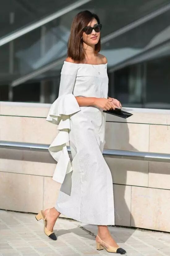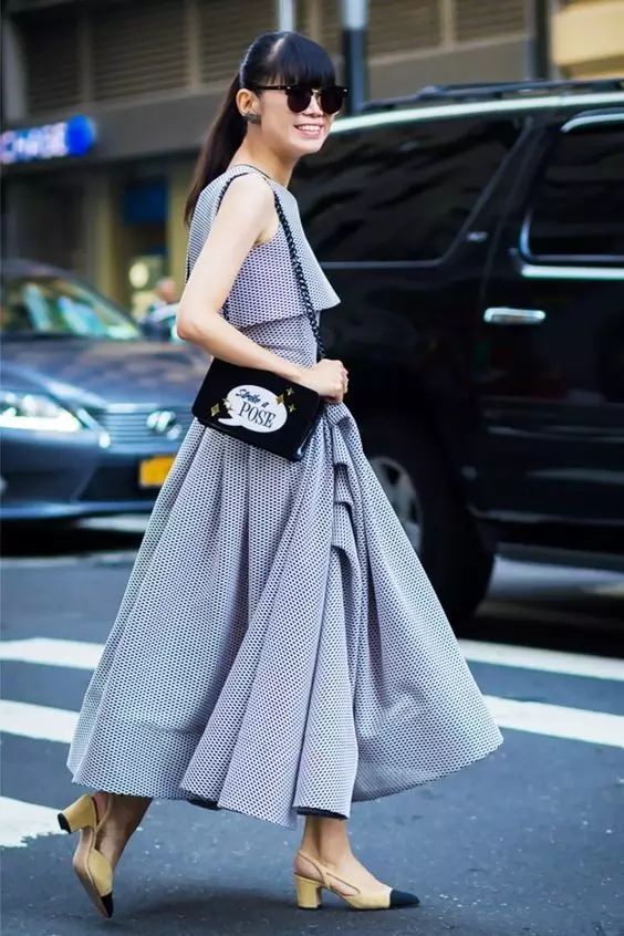 夏天一袭白色长裙透心凉, 放心穿黑色方跟,反正黑白的经典搭配不会出错。