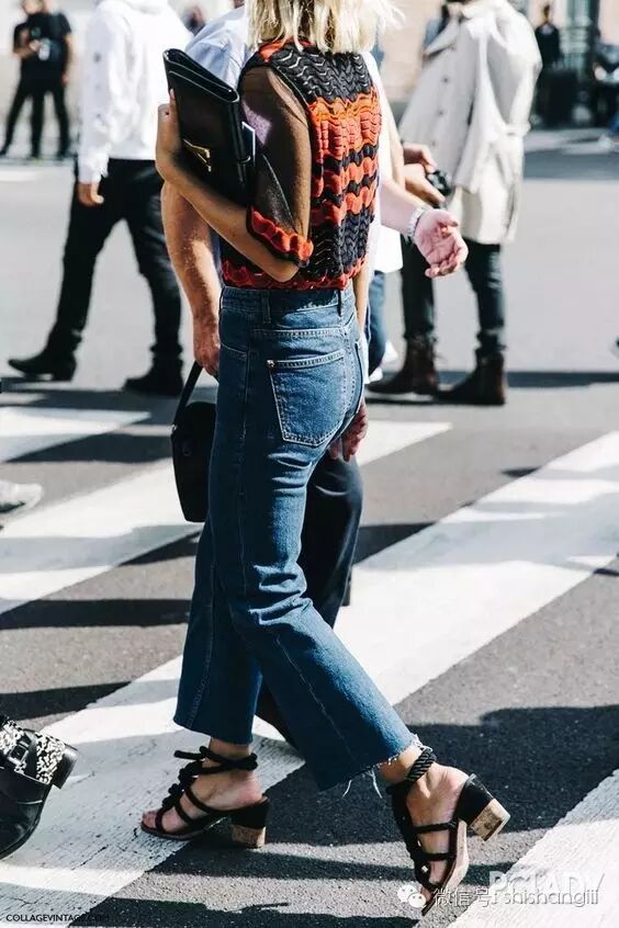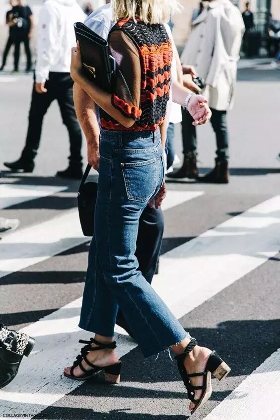 简单的黑色方跟绑带鞋子, 搭配九分牛仔裤,也很显时髦优雅。