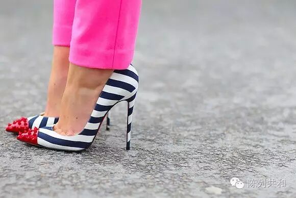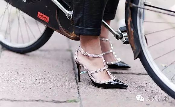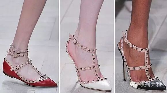 二、铆钉高跟鞋 谁说优雅和铆钉扯不上关系? 说到铆钉鞋,姑娘们一定会想起一直以优雅高贵著称的Valentino的Rockstud Pump,醒目却不张扬。即使没有真正买过,也一定见过它的仿款,堪称辛辣与甜美结合的典范。