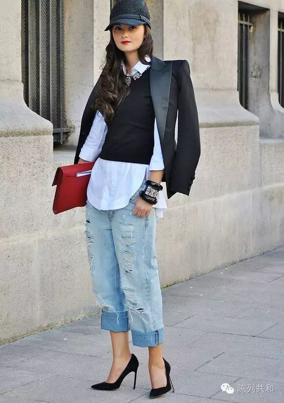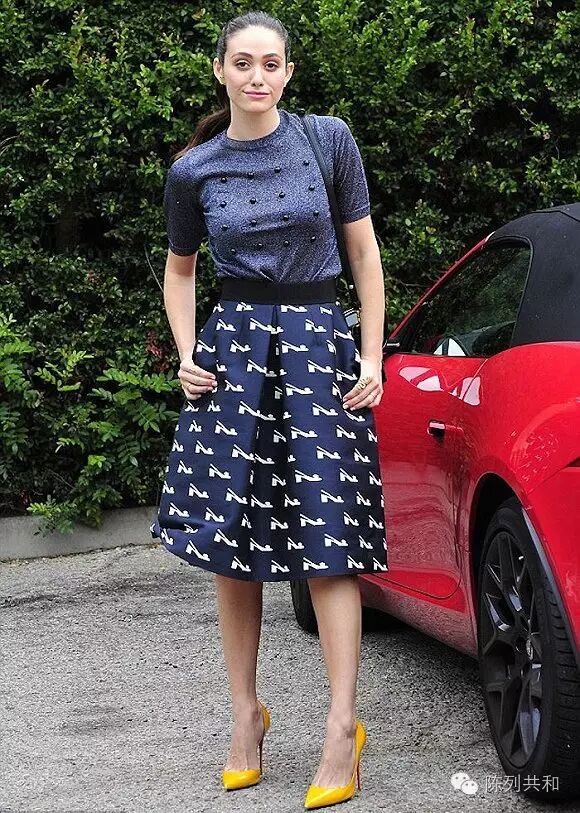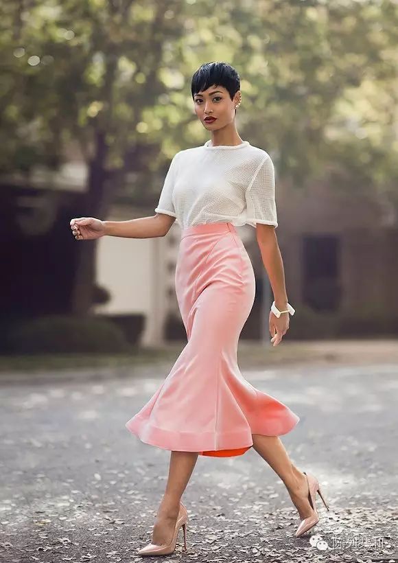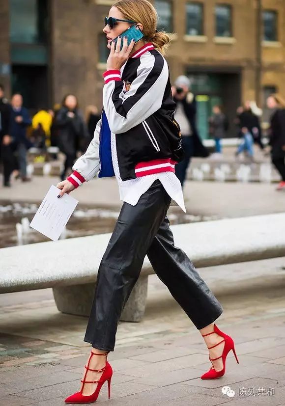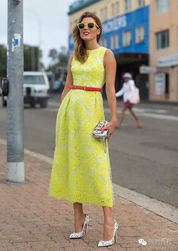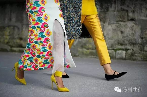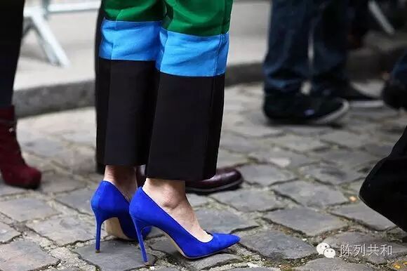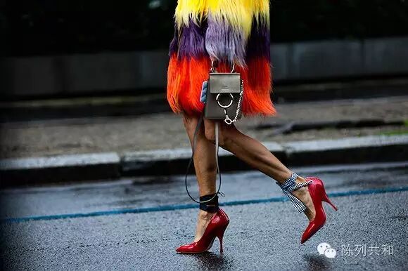 ▲裙装+铆钉高跟鞋,铆钉硬朗的元素和跳跃的颜色交相辉映,典雅知性中散发出不羁的格调和韵味。