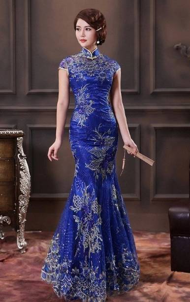 具有复古青瓷气息的一款蓝色花纹旗袍,具有大气感,造型上也需要花点心思,温婉的盘发,带点优雅轻熟感,配上珠宝坠饰,更显高贵感。