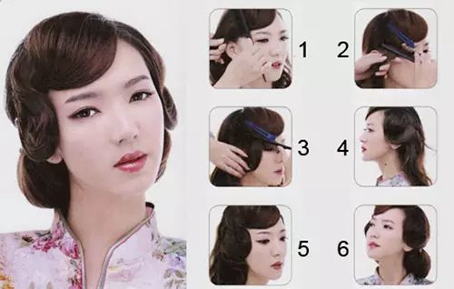 一、卷推式中式旗袍发型 1.将头发分为上下两区,刘海区用手推波做出s型。 2.右侧区头发顺势推出弧形固定,使其形状流畅。 3.刘海区剩余头发做第二个波浪形。 4.左侧区头发做外翻波浪形。 5.将两侧后区头发做成小包发,打造复古的感觉。 6.侧面整理成衔接流畅的上下两个包发。