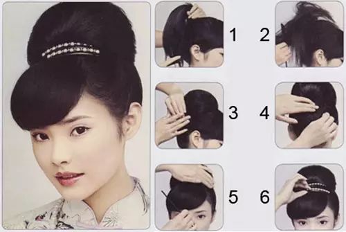 三、束盘式中式旗袍发型 1.将头发分为刘海区和后脑区,后区头发在头顶扎成马尾。 2.马尾全部倒梳打毛。 3.用包发梳将打毛后的头发由前往后梳成圆球形。 4.用发卡固定发尾,注意发尾和后区头发的衔接。 5.刘海用梳子打理出5型,体现女性的柔美。 6.选两排珍珠发夹在前后发区衔接处点缀,増加层次感。 更多旗袍+发型的搭配: