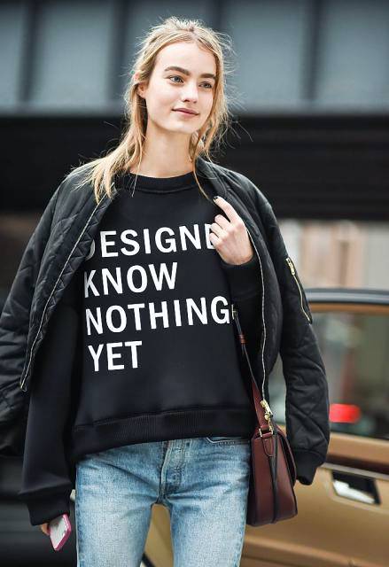 或者像超模Martha Hunt(玛莎·亨特)这样,用Slogan Tee搭配夹克,再穿双Sneaker去街头耍酷。