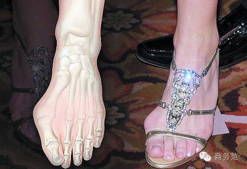 ------前方高能的分割线-------- 大家都知道难穿的高跟鞋穿了脚疼,但是比脚疼还严重的是长期穿不合适的高跟鞋,会造成拇指外翻,下面这张图,范主自己是看不下去的,好可pia....
