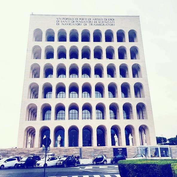 >>>> 走马灯内包含了罗马竞技场、万神庙、意大利文化宫等罗马当地标志性建筑。其中这座颇具气势的意大利文化宫又称“四方广场”,由墨索里尼法西斯政府出资建造,以石灰华大理石为原材料,四个立面整齐排列的拱形门窗多达216个,而今已变身成为Fendi的全球总部。
