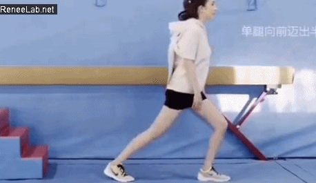 STEP2:两手叉腰,一条腿向前迈出半步做屈膝的动作,感受到另一条小腿拉紧的感觉了吗?保持20秒换一腿再试试。