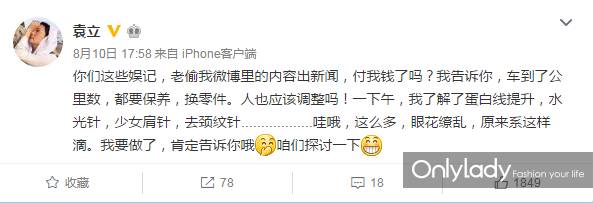 这两天,估计所有跟袁立同龄的女明星心情都不太好,因为耿直girl袁立发微博质疑好多同龄女演员是靠整容来实现“冻龄”效果! 她通过微博表示:“我看到很多同龄的女演员,都没有皱纹,好像“16”岁的花骨朵儿,肌肤吹弹可破。我绝对不相信,地心引力,对她们不起作用,其实我知道,很多男老偶像都做了眼袋了。请问哪些岁月调整医院比较好?因为演员之间,都说自己是运动和健身保持的。照这么说,运动员,脸上不老 喽!我不信,求推荐。”言语间直指娱乐圈内靠整容“冻龄”的现象。