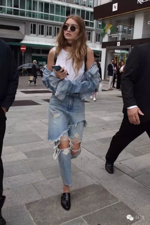 这么吸睛的一条牛仔裤,Gigi也因此成了上了时尚头条,说Gigi要引领丹宁新潮流。还说这是连山东超模Rihanna小姐都没尝试过得造型。