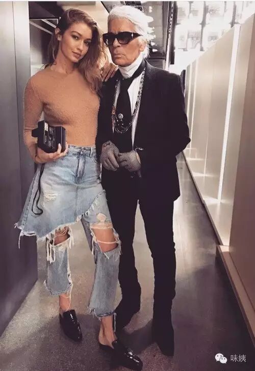 在秀场后台跟老佛爷合照时也穿着这条牛仔裤,还挺帅的。
