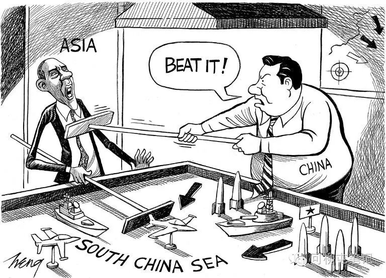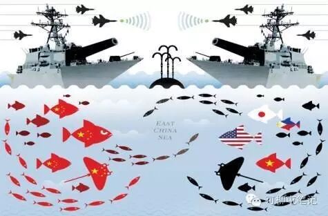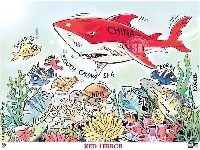 南中国海,大鲨鱼:中国,底下的小鱼虾分别是:新加坡 菲律宾 越南 印度。。。。
