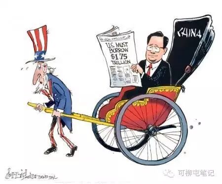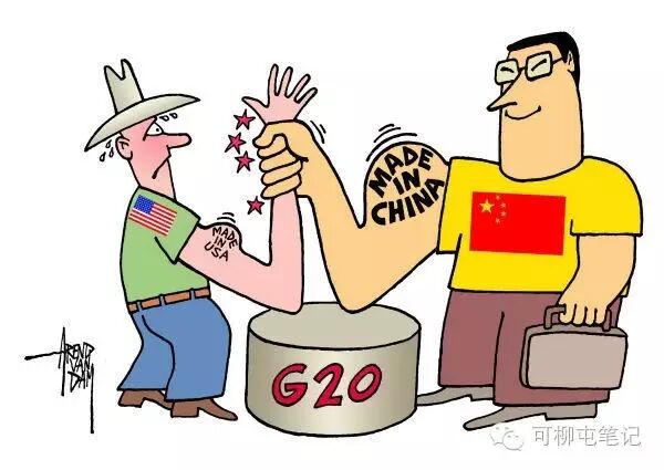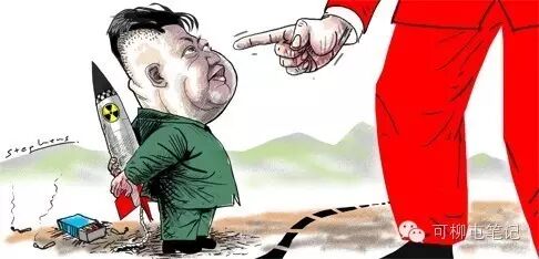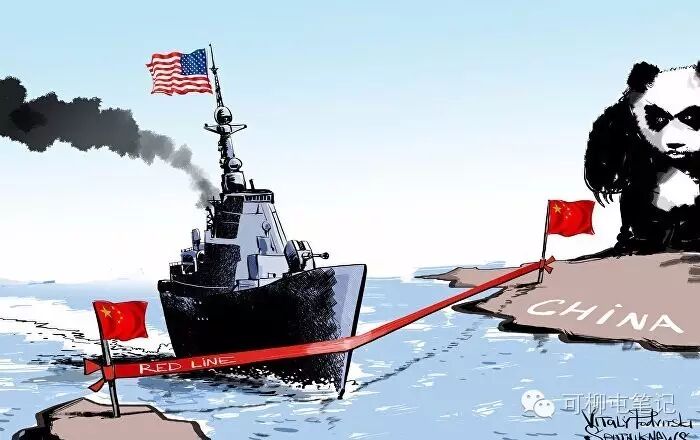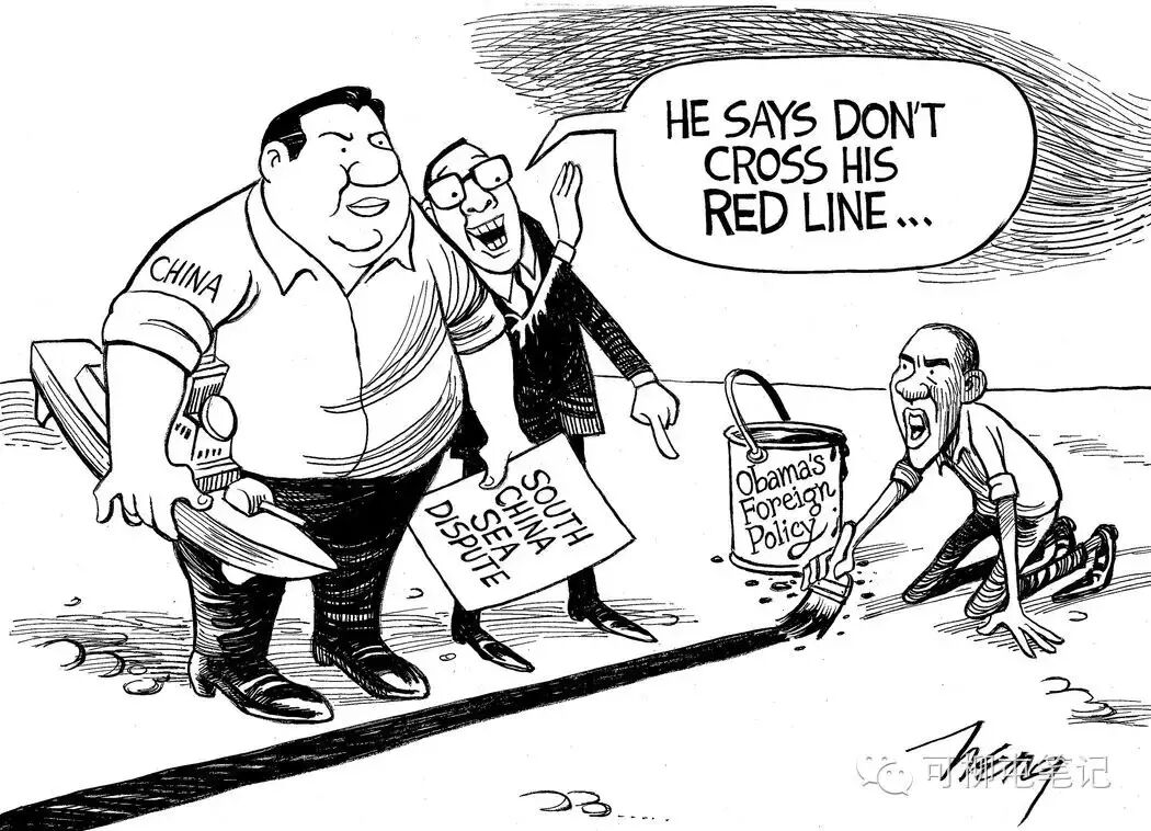 底下正在画红线的小个子是奥巴马,上面的大个子是中国,旁边人解释说:“他说,不要越过红线”