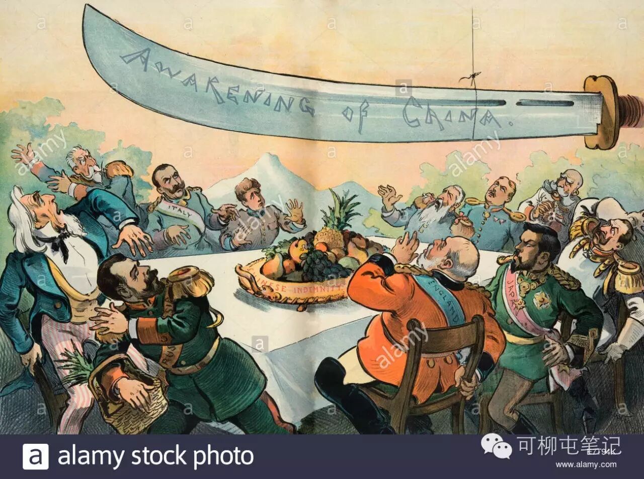民国:刀上的字为“中国觉醒”,可惜离中国真的站起来还早,不过说明当时西方就已经体察到中国一旦觉醒的威力