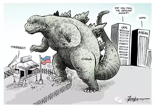 恐龙身上写的字是中国,小草房子里是菲律宾,后面的联合国(UN)问:"你听见地动山摇了吗?"旁边的东盟(asean)说:“没有!”,