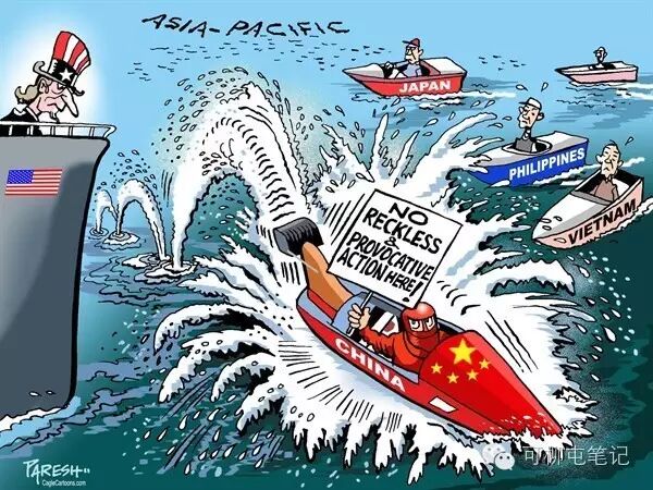 溅起巨大浪花的摩托艇上印的字为中国,上面的人举的牌子上写着:不要无理挑衅。周围的小船分别是越南菲律宾和日本等。呵呵
