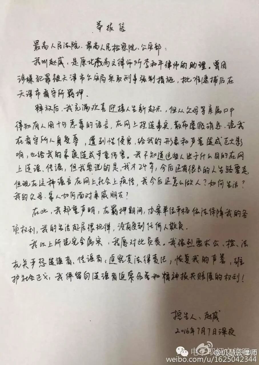 “我非常奇怪他们为什么会突然问起这个根本就没有的问题。后来我才知道,这事在境内外被炒得沸沸扬扬。”7月9日晚上,赵威再次发微博澄清道,这事事关她的声誉清白,取保候审当日,她即向有关部门递交了控告信,要求严惩造谣者、传谣者,追究其法律责任,并保留向造谣者追索赔偿精神损失的权利。