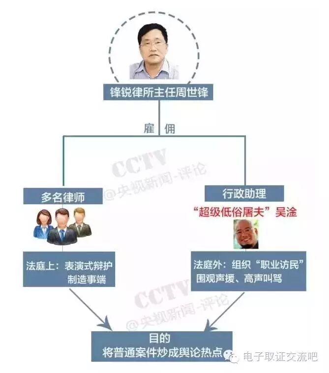 这些寄生于类似锋锐、轨道这样的律师事务所的死磕们,错误地将自己定位于游走于法律框架之外的特殊人群,他们嘴上叫嚷的是国家忠诚的反对者,行动上却是凌驾于法律之上,通过装神弄鬼、雇佣假访 民事举牌闹事,围堵、冲击法院,谩骂甚至攻击司法人员,制造各种极端事件博取关注,不断挑拨、激化各种社会矛盾,动辄以装迫害来裹胁民意,炒作网络舆论,一些律师甚至因此而成为网络红人。