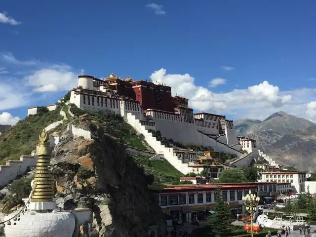 酒足饭饱的我们漫步布达拉宫。布达拉宫的宏伟是不负众望的,队友们即刻激情万丈的摆姿势,换行头。喜欢在美景中发呆的我索性坐在布宫广场的长椅上天马行空。时不时看看藏族妇女给队友等风来和小鱼儿编藏族小辫儿...。这高原适应的还真是有条不紊。