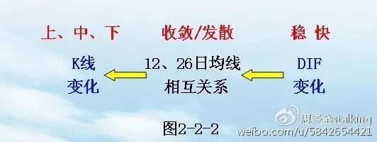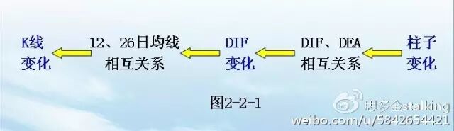 (或者 BAR:(DIF-DEA)*2,COLORSTICK;因为整个指标取名MACD,为防止混淆,可以把柱子叫做BAR)公式很简单,关键是要理解公式背后的思路。思路分析如下:1、先对杂乱的K线进行均值处理,求得12日均线、26日均线。均线的优点是比较稳定,但缺点是比较滞后。2、那么如何改进缺点呢?对两根均线进行差值处理,求得均线差DIF。均线差可以快速地反映两根均线的相互关系,均线差具有又稳又快的特点。DIF可以看做是DIF自身的1日均线,DEA是DIF的9日均线。(2)对DIF、DEA进行差值处理,求得均线差BAR,即柱子。MACD指标:先计算12日均线、26日均线的差值,即DIF;再计算DIF、DEA(DIF的9日均线)的差值,即柱子。其实就是:“‘均线差’的‘均线差’”(进行了2次求稳求快处理)。与杂乱的K线相比,MACD指标的柱子形态稳定、不滞后,具有又稳又快的特点。许多人认为指标滞后,大多是基于“指标来源于K线、必然滞后”的简单推断,带有想当然的成分。既然柱子形态具有又稳又快的特点,那么如何利用呢?方法就是:利用稳定快速的柱子变化,反推稳定快速的DIF变化,再反推杂乱的K线变化。因为是2次重复的反推过程,为了简单,这里以1次反推进行示例说明,整个过程不再详述。如图2-2-2所示: