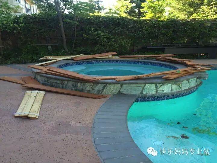 弧型蓝色的游泳池在夏日的余晖下散发出凉爽的气息。身着黑色Tshirt、黑色短裤的大儿子,满头大汗,把一堆儿一堆儿棕红色木块儿,放在游泳池的灰色砖沿边上。他回身看看我,指着一坨一坨的木块儿说: