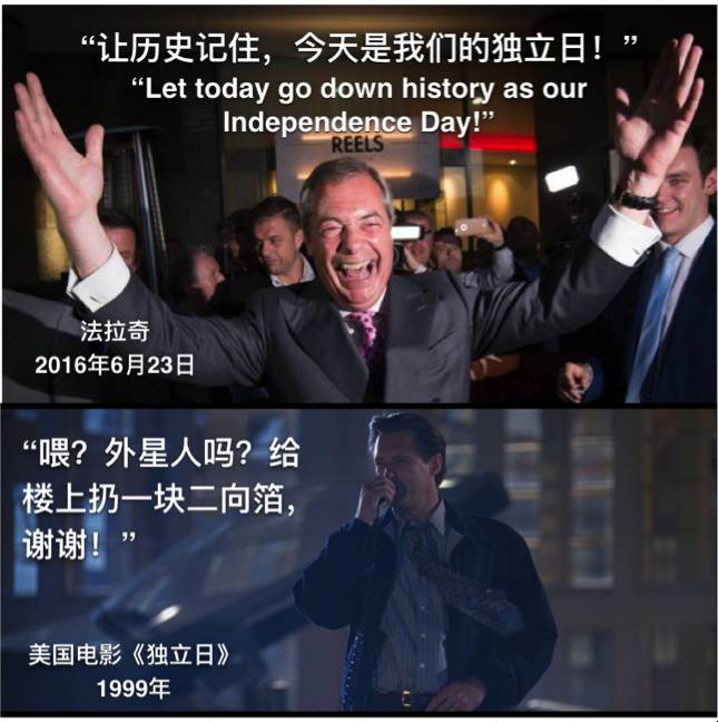 得知消息后的法拉奇,立刻Cosplay了电影《独立日》里的和外星人决一死战的美国总统,用气吞山河的气势发出了引力波威慑,“让历史永远记住6月23日这一天!这是我们的独!立!日!”