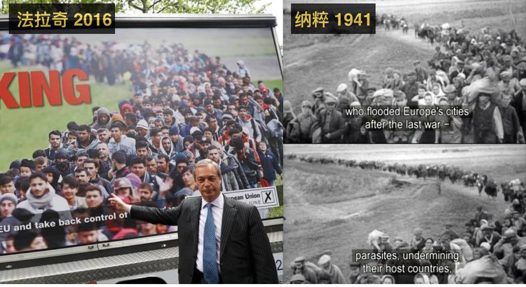 法拉奇也没有放过任何一个让移民背锅的机会。公投前几天,他揭幕了下面这张臭名昭著的海报,与1940年纳粹为迫害犹太人找借口的宣传片惊人相似。