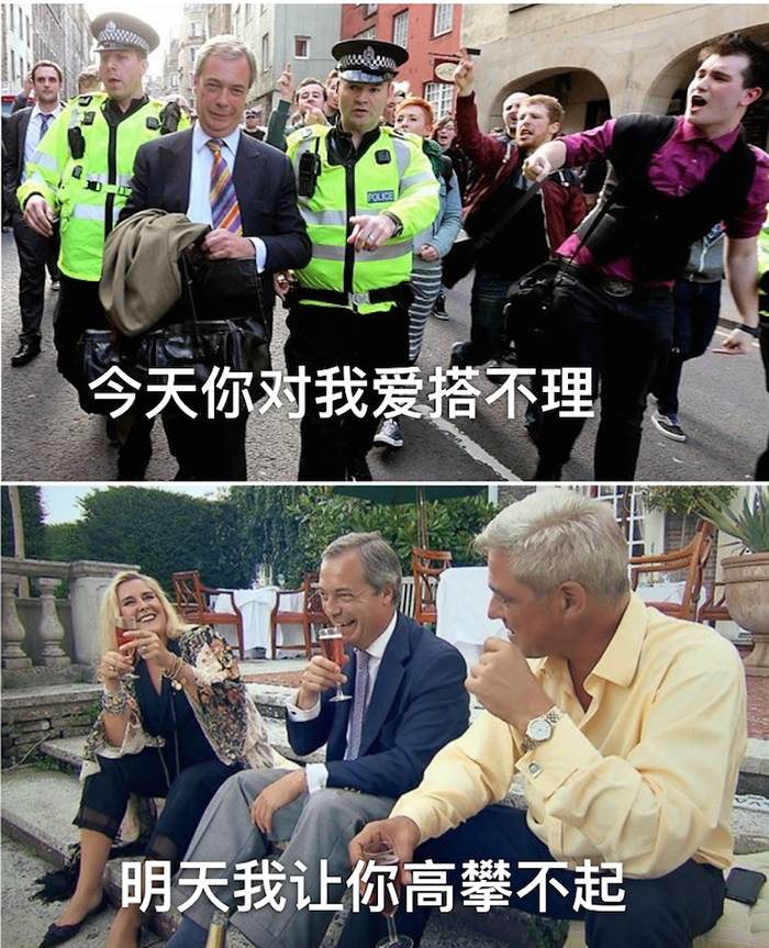 “观众朋友我想死你们了!我就是那个三十年来如一日,努力让英国脱欧的法拉奇啊!让我们从欧洲列强的手里,重夺控制权吧 (take control back)!”