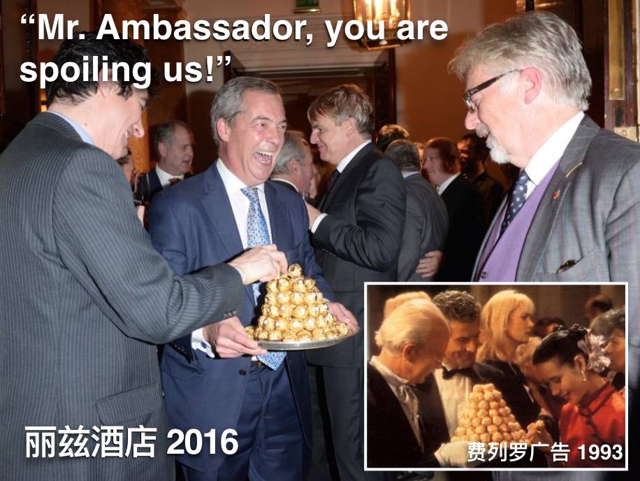 举办派对的是亿万富翁Barclays兄弟,也是丽兹酒店和多家媒体的拥有者。出席派对人的包括卡梅伦的牛津同窗,保守党要员Jacob Rees-Mogg,还有商业大亨,工党长期捐助人John Mills。这些曾今剑拔弩张的人,在此尽释前嫌。不少人也许想到之前对法拉奇的诸多嘲讽,有些心虚,显得低声下气的。贴心的法拉奇立刻给他们端出了金光闪闪的一大盘费列多“大使之选”巧克力。这些平时锦衣玉食,啖惯比利时名贵手工巧克力的精英们,看到这种接地气的甜食,立刻理解到里面的含义。他们知趣地喊出90年代费列罗巧克力的广告语,“大使先生,你这是要惯坏我们啊!”