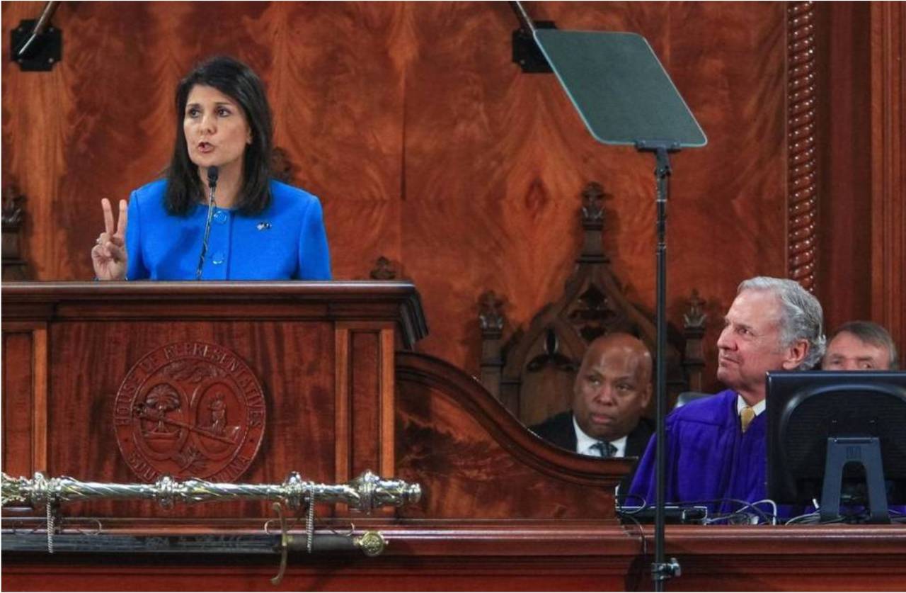 Nikki Haley签字去除联邦战斗旗,这在当时是一个很大的新闻了,一方面这是南卡的一项传统,保守派口中“纪念他们为捍卫南方主权与生活方式、抵御北方入侵的标志”[3]被一个移民后代州长拿掉了,也是顶着很大压力的;另一方面在保守派把持政府的南方,做一件讨好自由派和黑人的事情,自然有人不开心。