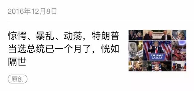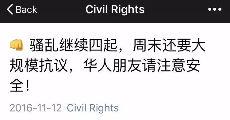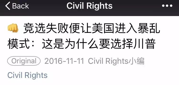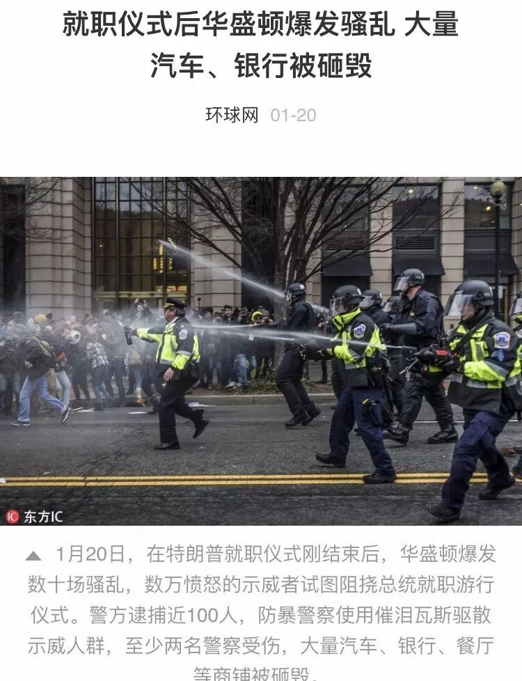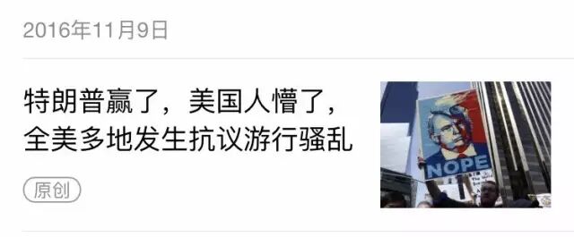 比如川普当选后美国各城市都有示威游行活动,虽然绝大多数都是和平的示威,结果到了这些公众号口中就变成了惊悚的标题。