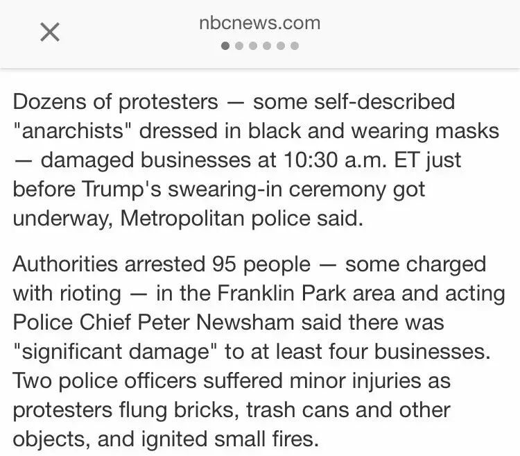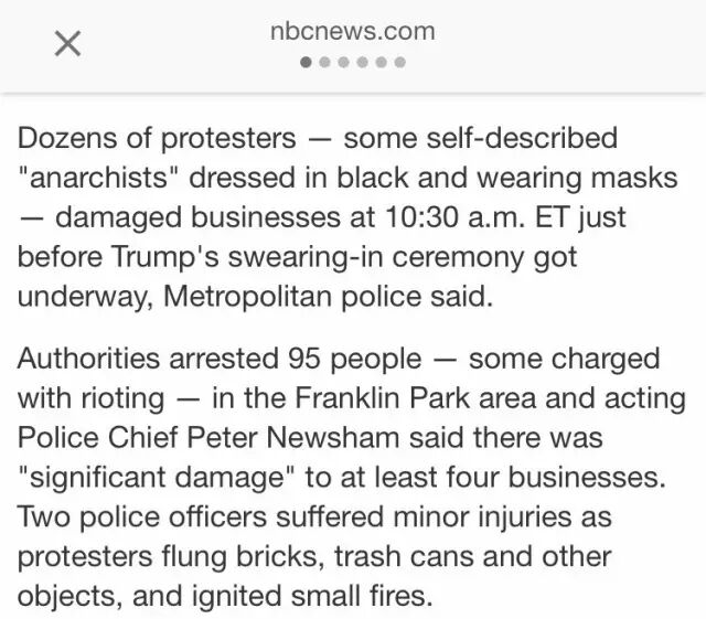 到底发生了什么?MSNBC报道,在就职演说前有一小群“自称”(self-sescribed)的“无政府主义者”(anarchists)穿着黑衣在东部时间10点半左右,于13th & I st NW附近打砸抢(十几处?)。警察逮捕了95人,其中的一部分被指控暴乱(并非所有95人),已确认有起码4四间商铺遭砸(大量?)。这些暴乱者和“总统就职游行”没有任何阻拦和冲突,离总统就职游行路线也有五条街远[1]。