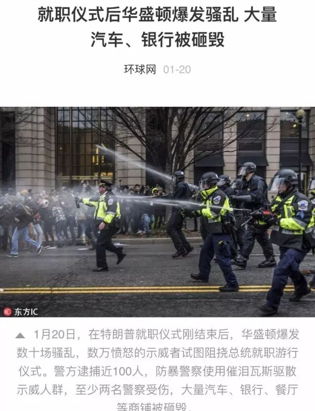 更有胜者,直接拿“十几个自称反川黑衣人”打砸抢,活生生渲染成了“华盛顿十几处骚乱,大量汽车和店铺被砸,以试图阻挠总统就职游行。