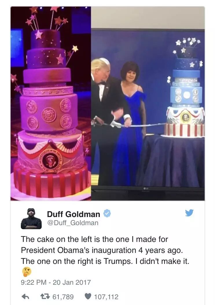 川普就职大典还做了个跟奥巴马四年前就职典礼一模一样的蛋糕,气得去年蛋糕的制作者发推声明“这个不是我做的!但是长得一模一样!”