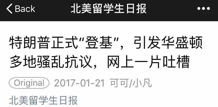 关于川普就职仪式的报道,北留报还发了一个非常有误导性的标题。文章讲述了一群黑衣人在华盛顿焚烧了一辆林肯轿车,砸了一家新巴克和一家国富银行的玻璃,在标题中就变成了“多地骚乱”,“网上一片吐槽”明明是大家笑话今年就职典礼人数稀少,在整句话中理解便是“骚乱引发吐槽”。