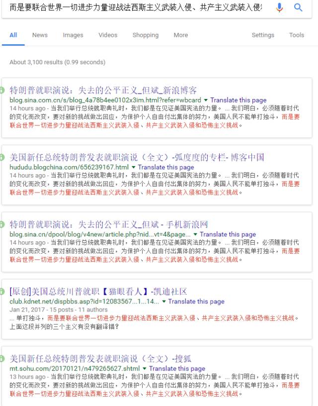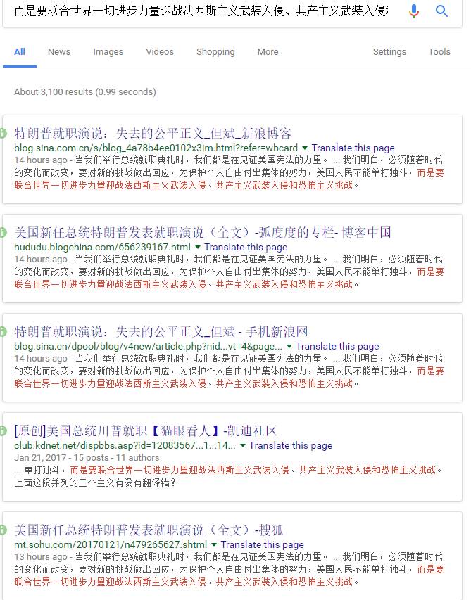公众号“驱动评论”和“悦读客”(不知道谁抄得谁,还是大家都抄了同一处)“全网首发”了一篇三观极正的“川普就职演说中文翻译全文”。就算不与演说原文作对比,直接看内容就知道一定是假的。作者你什么时候见过川普如此政治正确要“关照弱者”?什么时候听过他要“反对政府集权”?你不知道川普就是集权专制派(authoritarian)的代表和集大成者吗?
