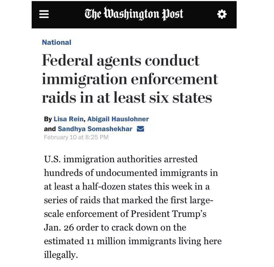 2月10日周五下午,移民局突袭了至少六个州,抓捕非法移民。这届美国政府应该是深谙记者律师周五下班回家欢度周末的习惯,像颁布“穆斯林七国禁令”一样, 专门喜欢在周五下午开动打得人措手不及。