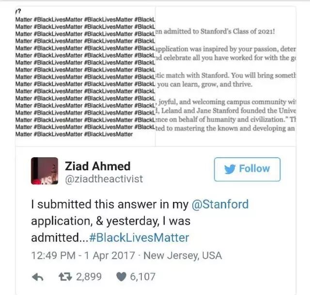 其实从阿麦德本人这番话(之前认定自己不可能被录取),以及他已经被耶鲁和普林斯顿录取的事实,我们可以推测,他很可能并不想去斯坦福,对普林斯顿、耶鲁又胸有成竹,所以并没有认真对待斯坦福的申请文书。写下一百遍Black lives matter就寄出了事。但斯坦福觉得这位同学太过优秀,所以不以为意,还是录取了他。