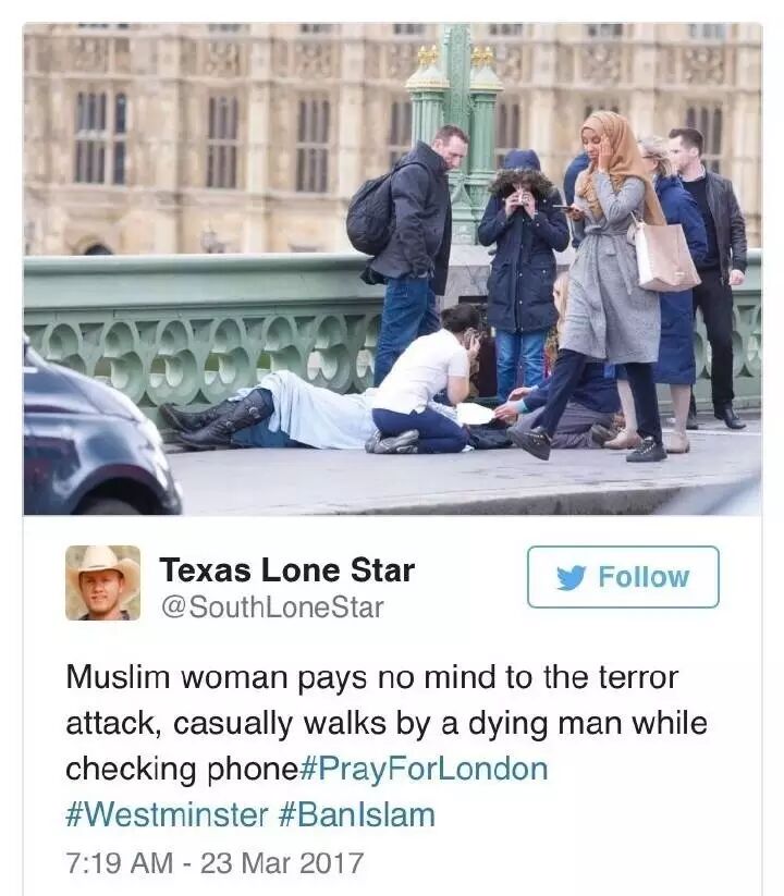 网络上一些别有用心的人,断章取义地截取了这位姑娘的照片,高喊:“其他人都在关心受害者,只有穆斯林若无其事在玩手机!看看!这就是穆斯林!”