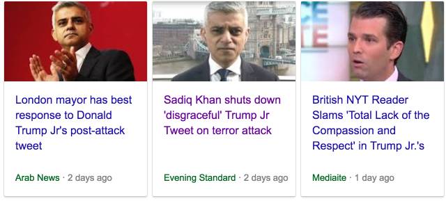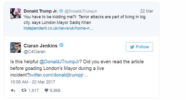 除此之外,如此高曝光的反穆机会,川普一家倒也没放过。川普太子Donald Jr. Trump立刻抓住时机,抹黑伦敦市长Sadiq Khan。太子截取了Khan之前的讲话进行断章取义,大喊“开什么玩笑?!伦敦市长说恐袭是住在大城市里的正常情况!” 群众纷纷转贴表示“穆斯林市长根本不在乎伦敦恐袭”。