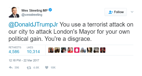 “@川普太子。你为了自己的政治立场,利用一场恐怖袭击来趁机抹黑伦敦市长。你。无。耻。”