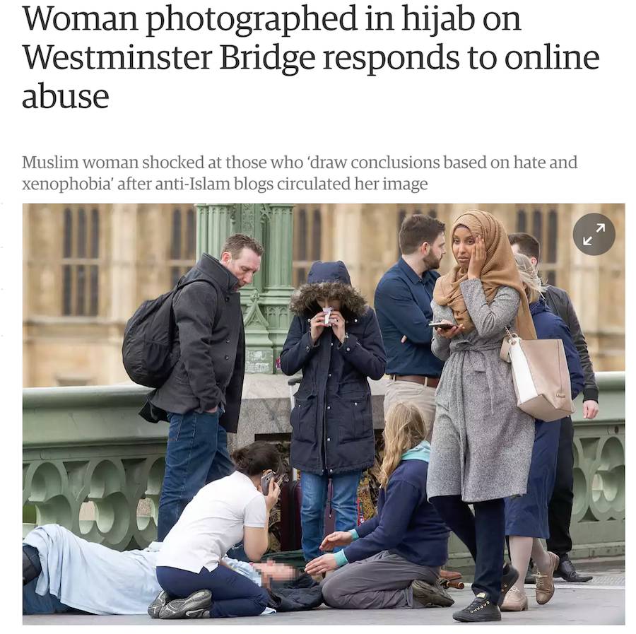 近日,伦敦发生恐袭。土生土长的54岁英国人Khalid Massod被恐怖主义洗脑后,在伦敦议会大厦前制造血案。一位惨案的目击者、穆斯林姑娘惊吓中给家人打电话,和其他许多路人一起被记者拍了下来。